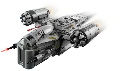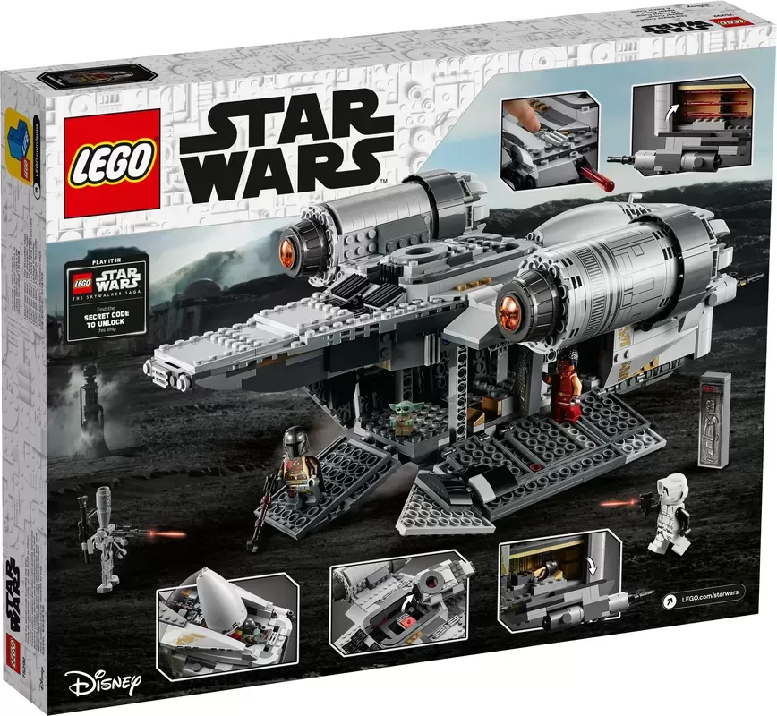 The Razor Crest has a dual LEttgGO® minifigure cockpit, 2 spring-loaded shooters, cargo hold with opening sides/access ramps and carbonite bounty elements inside, sleeping area and detachable escape pod for creative play.