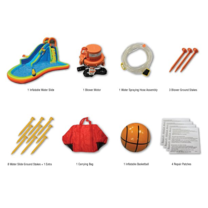 - Cushioned slick slide and splash activity pool! Basketball hoop challenge includes (1) inflatable basketball.