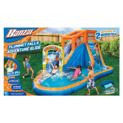 . Banzai Plummet Falls Adventure Slide Inflatable Outdoor Waterslide Packaging includes: 1 inflatable water slide, 1 blower motor, 1 water-spraying hose assembly, 3 blower ground stakes, 8 water slide ground stakes, 2 water weight bags, 1 carrying bag, instruction manual and 4 repair patches