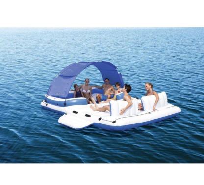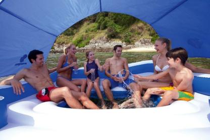 Beat the heat this summer with all of your friends on the 6 Person Floating Island Lounge. Featuring a built in carry along cooler and a removable canopy you can cool off in more ways than one. The all around grab line and sturdy handles with swimming platform makes getting on and off the island a breeze. Finally, the 6 Person Floating Island Lounge comes with extra wide pillow backrests, six cup holders, and a retractable sun shade canopy to keep the sun off your back. For more summer fun under the sun, hop on the 6 Person Floating Island Lounge.