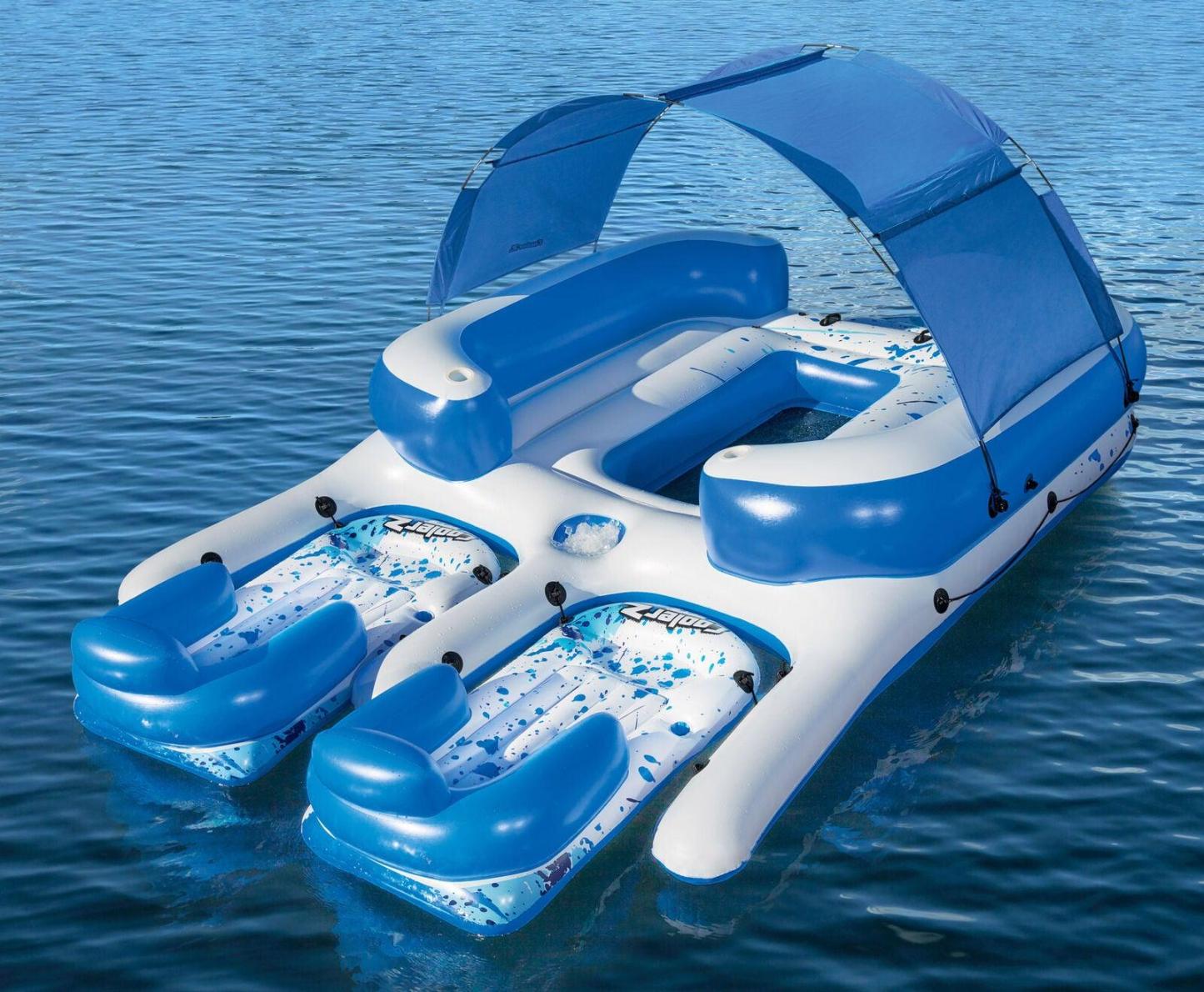 📣 Checkout Our New 8-Person Inflatable Floating Island Party Float with UV Sun Shade and Connecting Lounge Rafts
