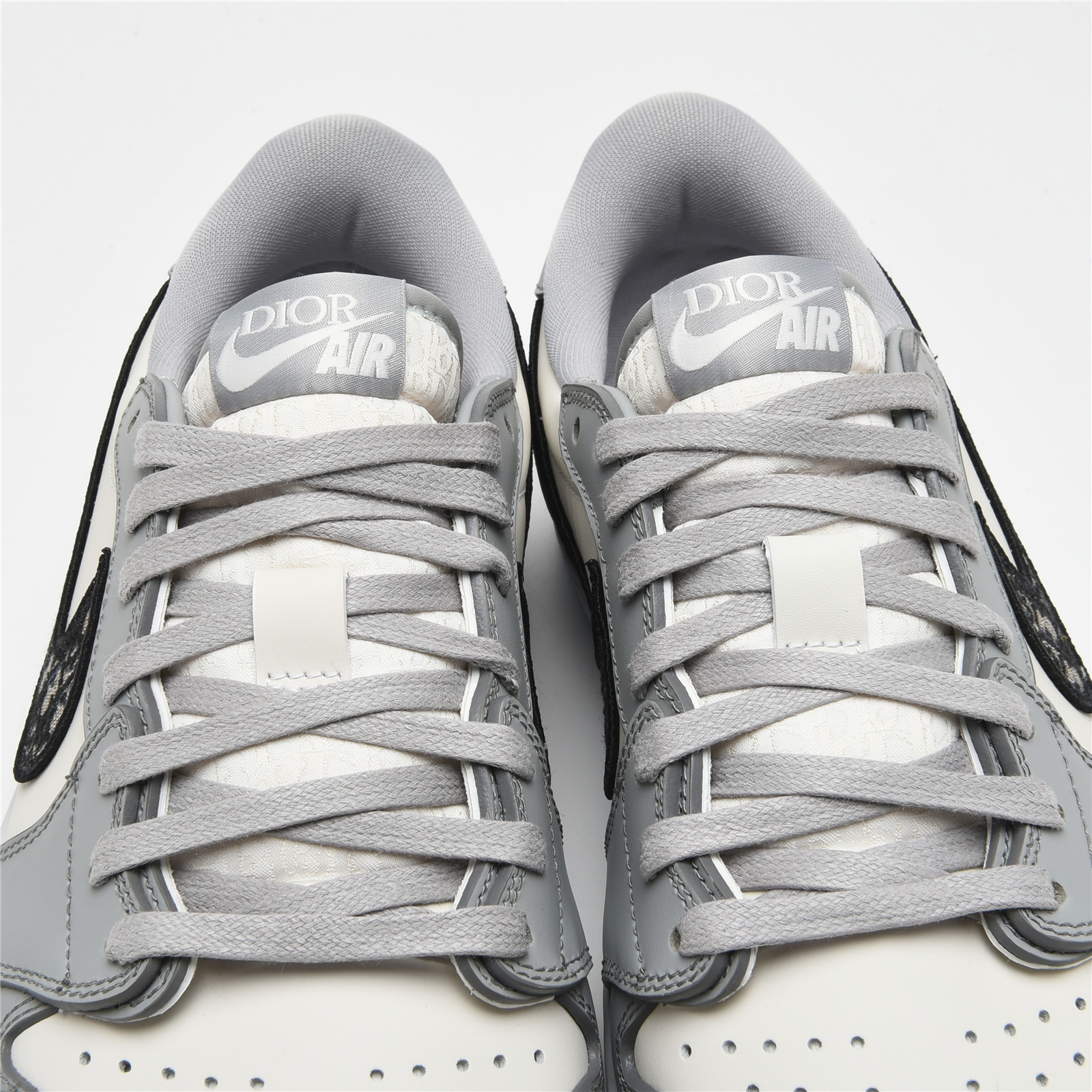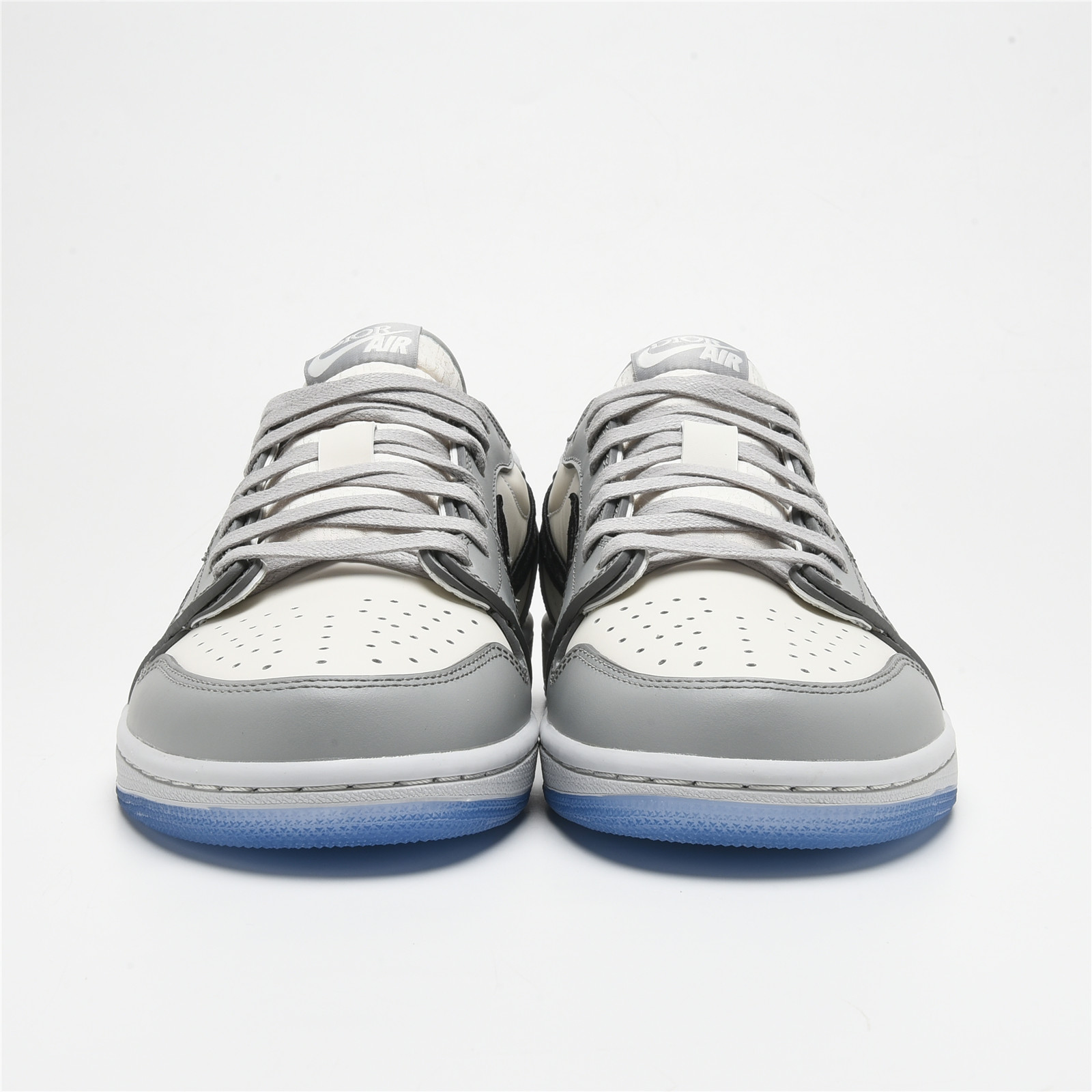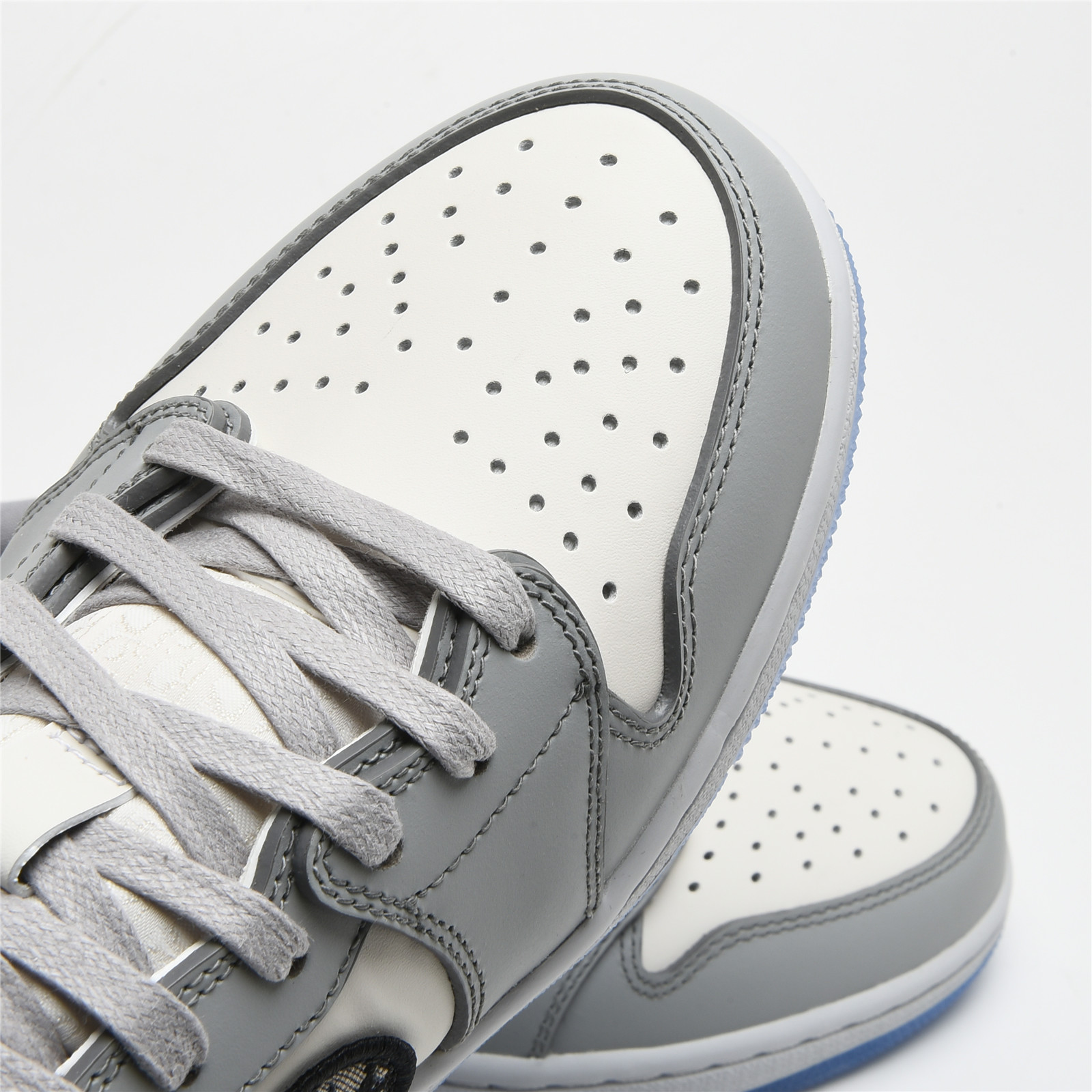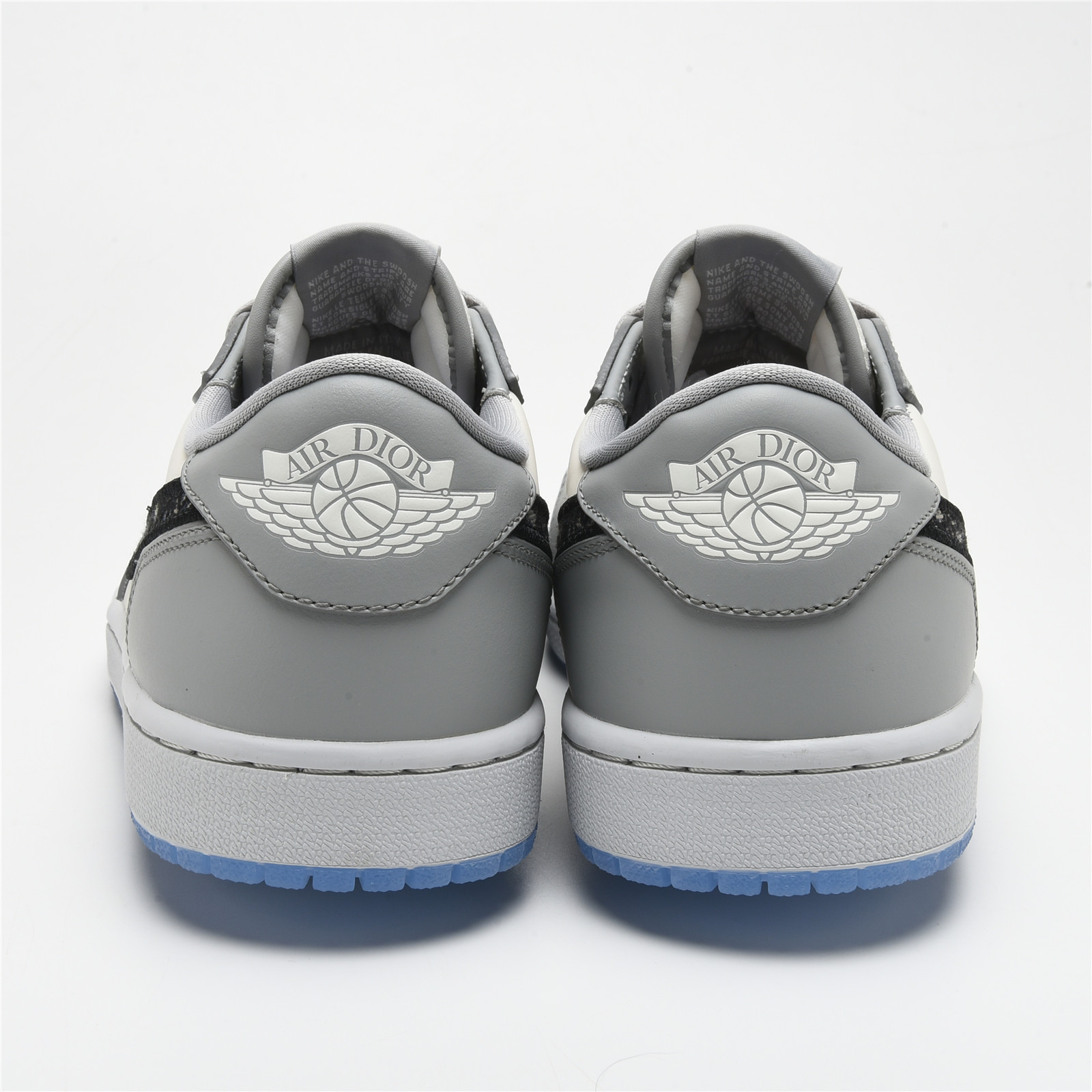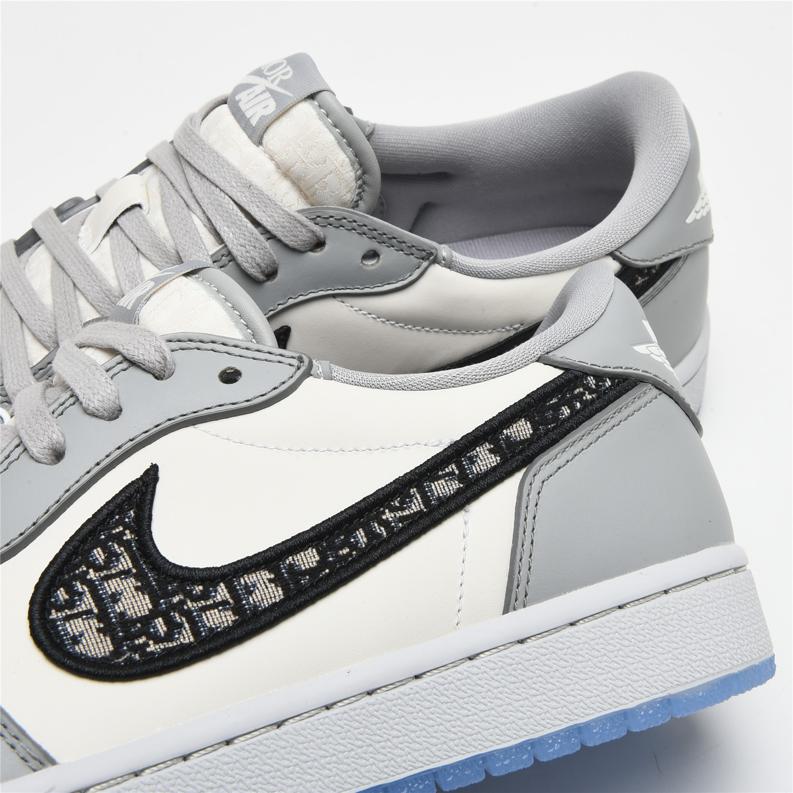 This Jordan 1 Retro High is composed of a white and grey leather upper with traditional Dior monogram print Swoosh. These shoes are made in Italy with premium materials. Co-branded icy translucent soles, Dior branded tongue and Wings logo, and a silver "Air Dior" hang tag completes the design.