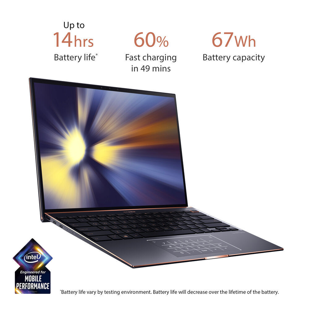 Stay productive while on the go with the ASUS 13.9" ZenBook S UX393EA-XB77T Multi-Touch Laptop. It features a compact, all-metal unibody design with a Jade Black livery and Red Copper diamond-cut highlights. Powered by an 11th Gen 2.8 GHz Intel Core i7-1165G7 Quad-Core processor and 16GB of LPDDR4X RAM, this laptop can handle the productivity apps you need. The 1TB M.2 NVMe PCIe SSD allows for faster boot times. Connect to the internet via Wi-Fi 6 (802.11ax). You can also connect to accessories and peripherals wirelessly with Bluetooth 5.0.