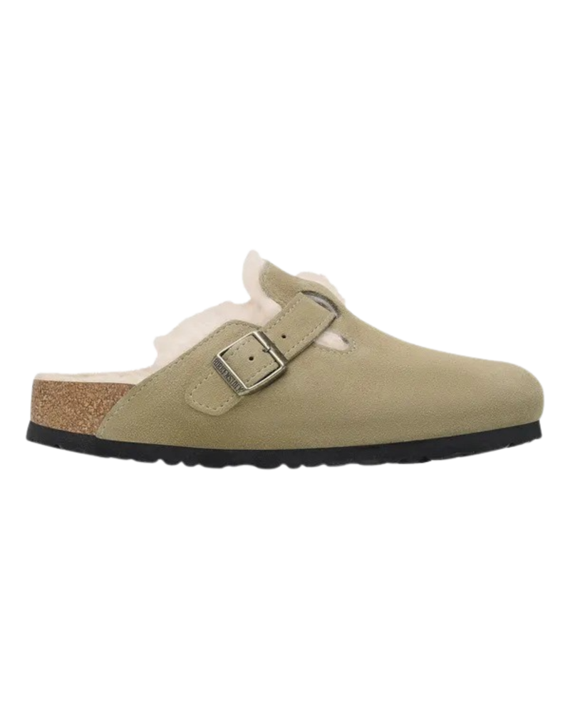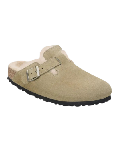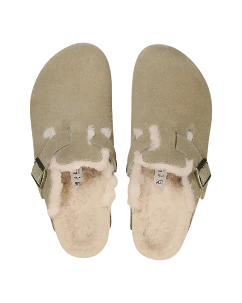 Go bold and stay cosy with the Birkenstock Womens Boston Shearling Suede Leather Sandals in Taupe!