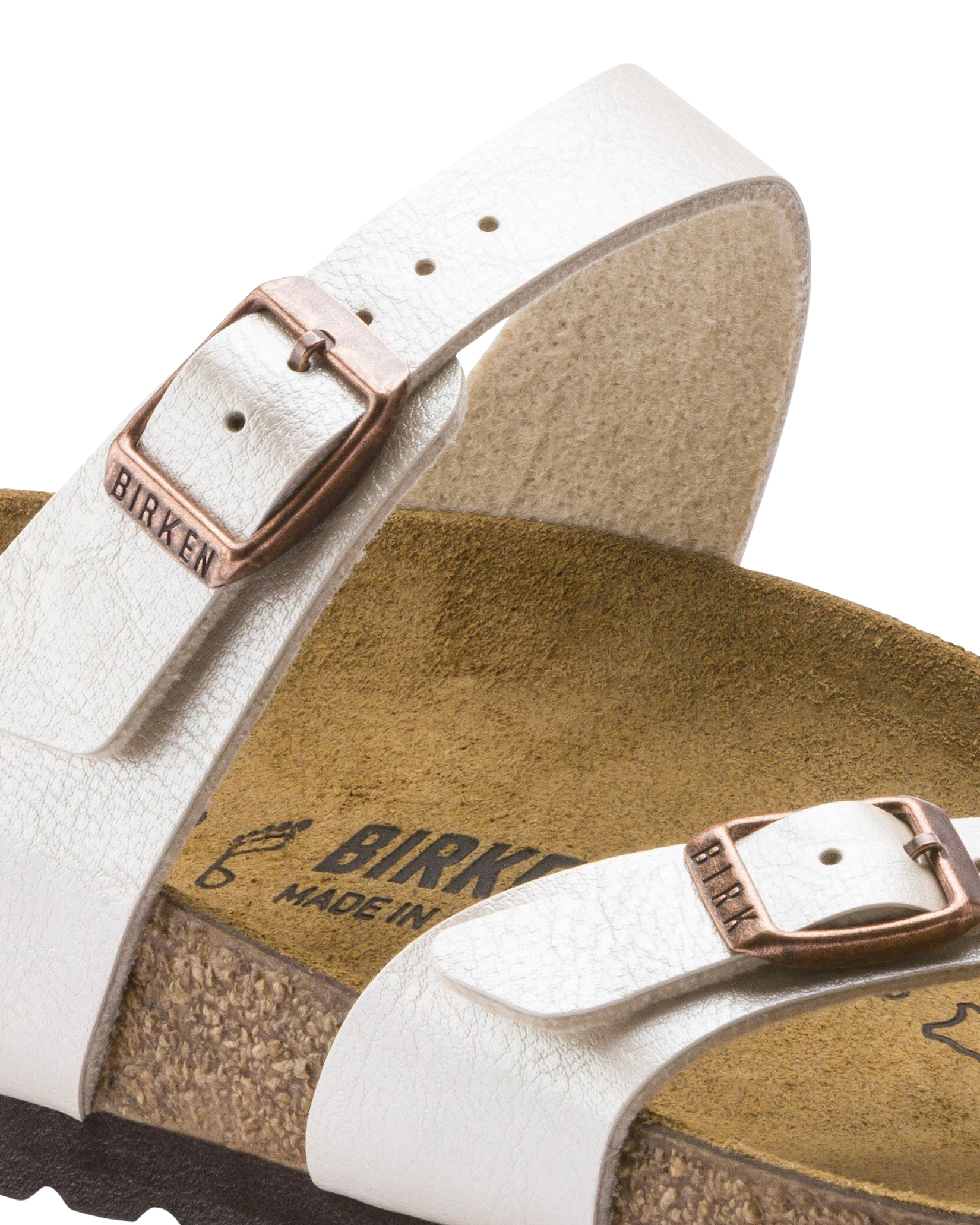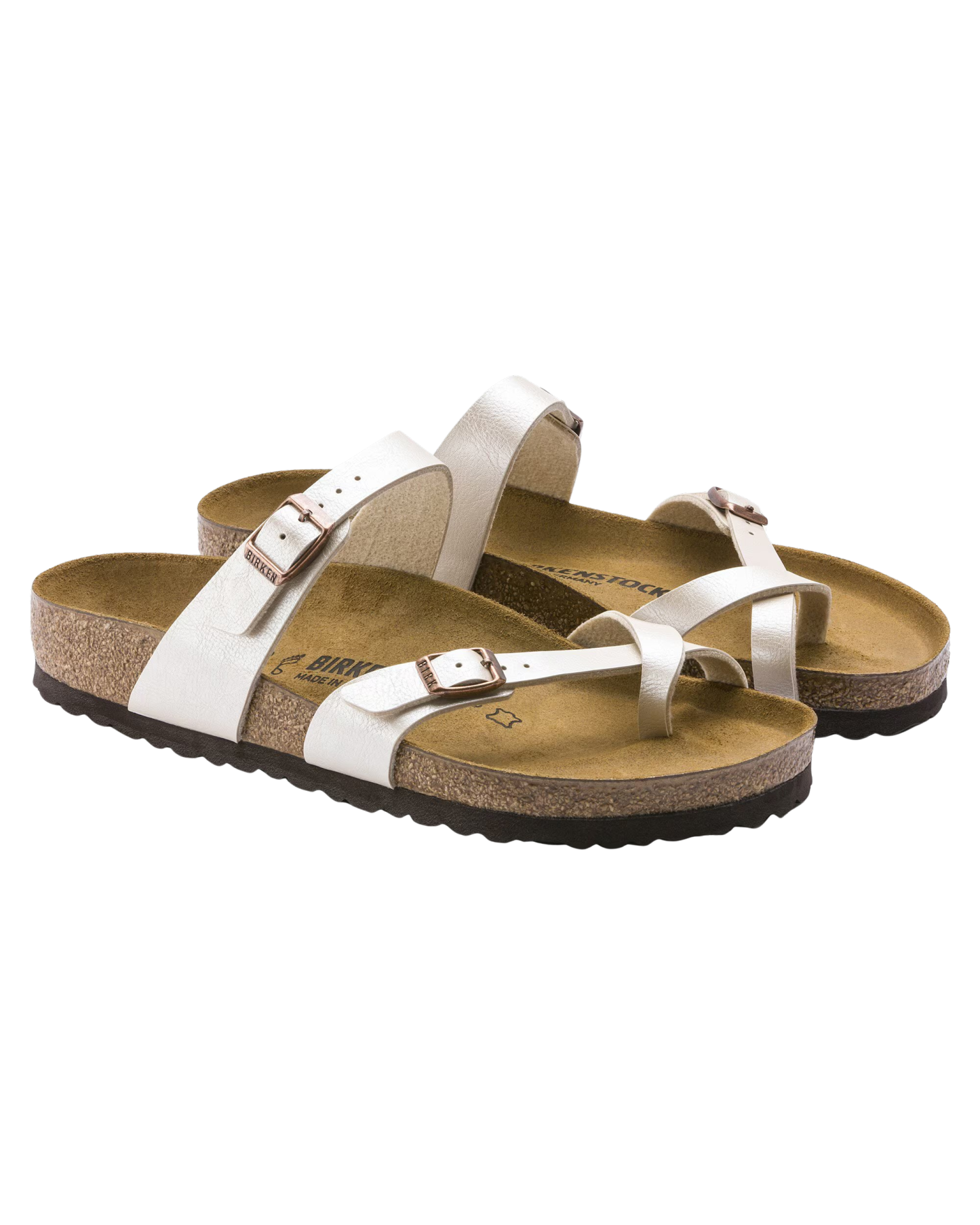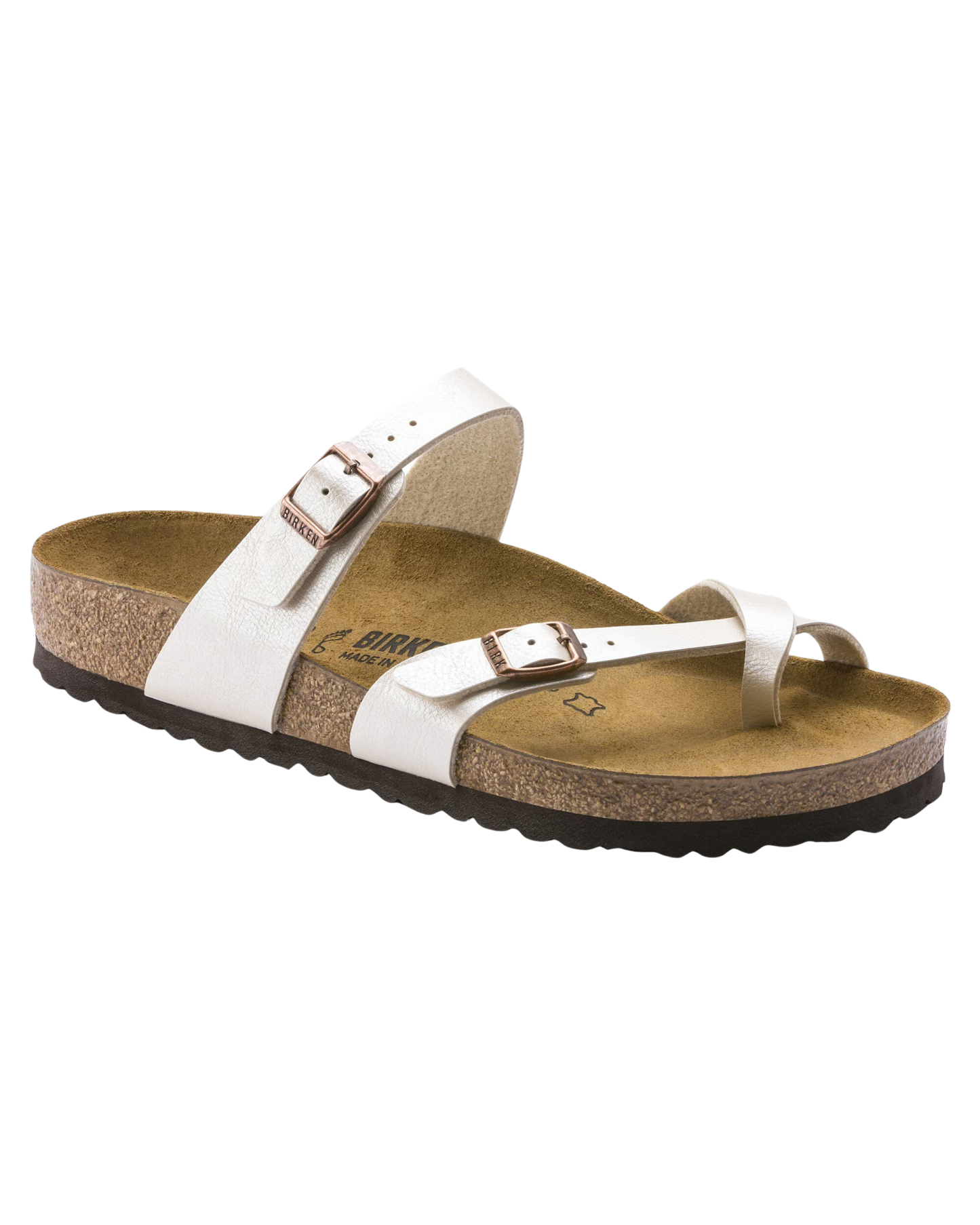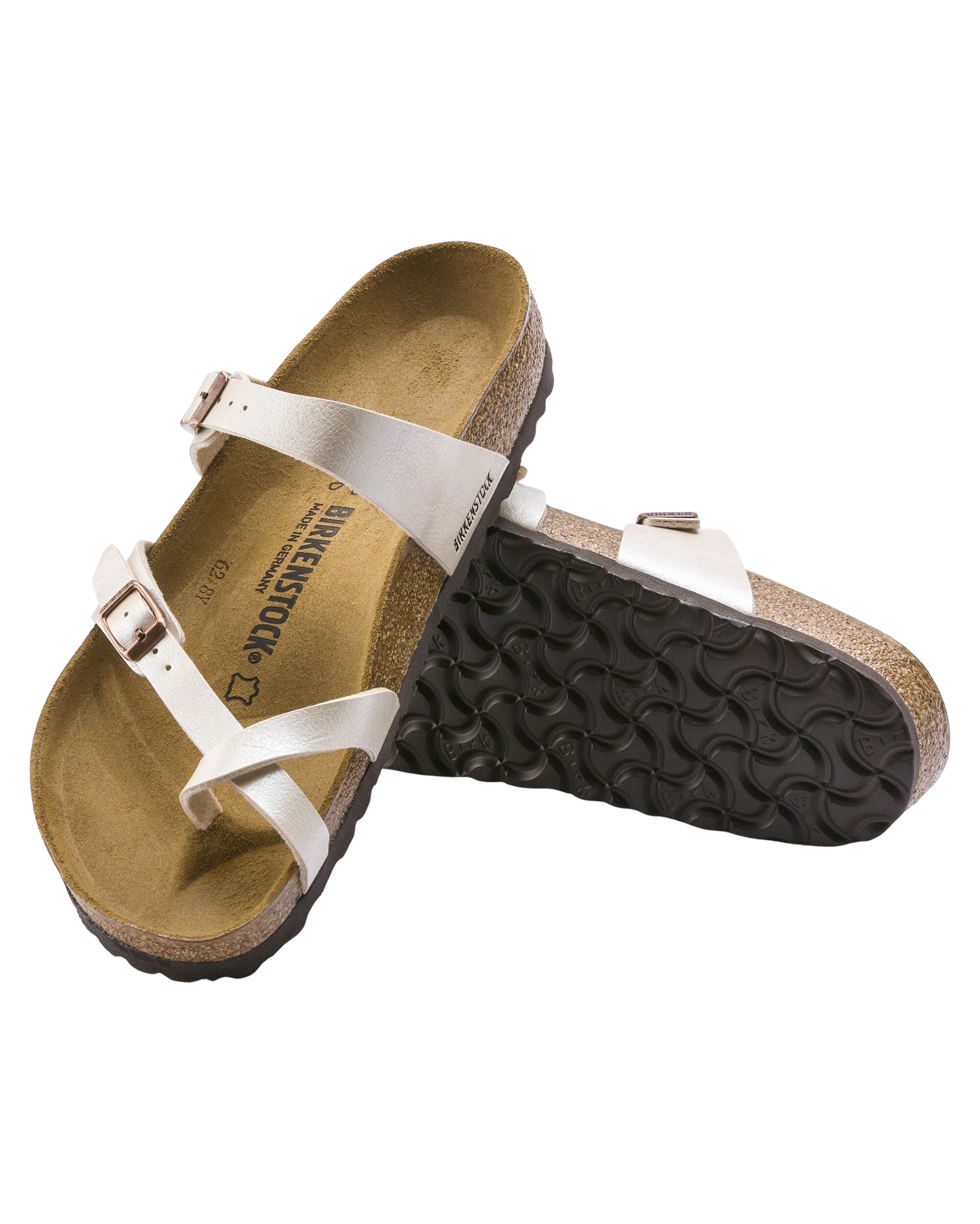 Step into style and comfort with the Birkenstock Womens Mayari Mayari sandals in Graceful Pearl White. Featuring chic crisscross straps and a touch of shimmer from the dazzling Birko-Flor® material, these sandals are a true showstopper this season. Plus, they're built on Birkenstock's iconic contoured footbed, giving you unparalleled support for all-day wear. Shine bright and stay comfy-Mayari has it all!