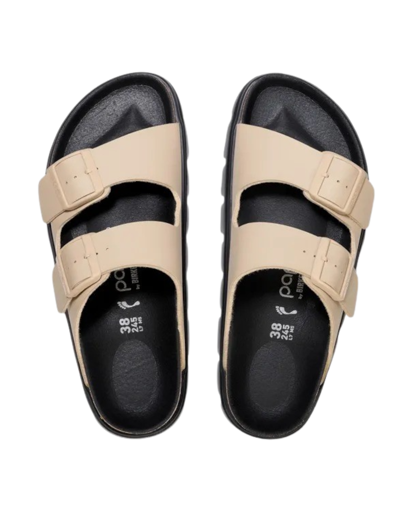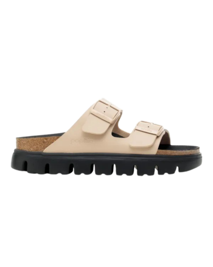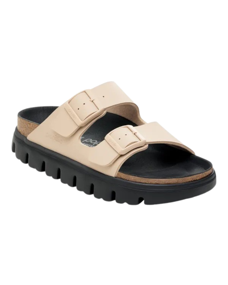Introducing the Birkenstock Womens Papillio Arizona Chunky Birko-Flor Sandals in Sandcastle, a bold upgrade to the Arizona with a platform sole that elevates both your look and your stride.
