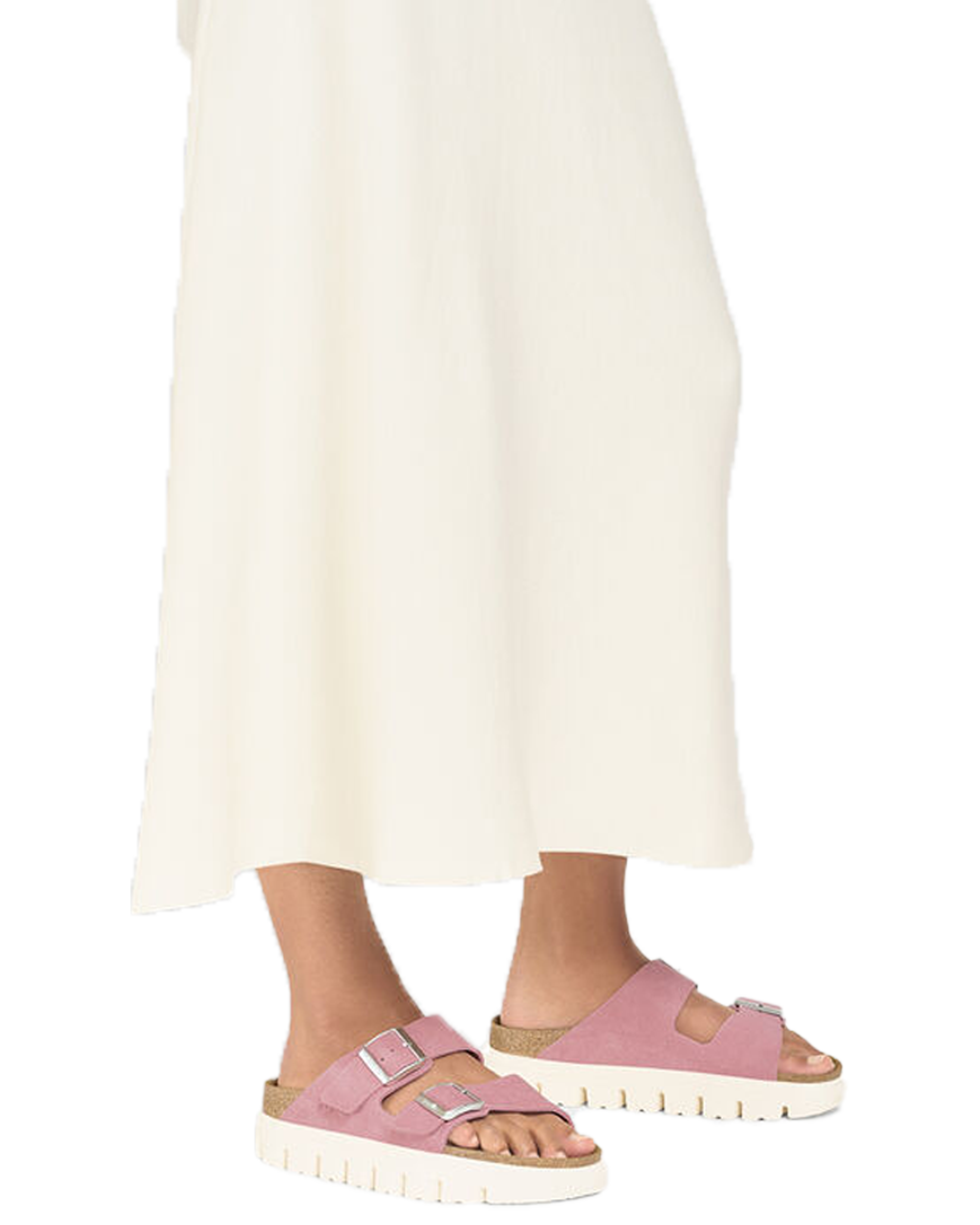 Crafted with a suede upper in a vibrant and popping candy pink, these sandals exude both comfort and fashion-forward charm. The anatomically shaped cork-latex footbed offers unparalleled support, while the suede footbed lining enhances your walking experience.
