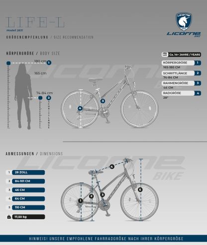 A 28-inch hybrid bicycle with fork suspension for everyone who is looking for a robust everyday companion for daily use through the terrain and for city rides. The 21-speed Shimano derailleur gears gives you a smooth gear ratio for all riding conditions. The Life 28-inch hybrid bicycle is an excellent bicycle. The bicycle is equipped with front and rear lights and complies with German road traffic regulations. The bicycle is delivered 85% pre-assembled. The final assembly of the bicycle is done by the customer. The tools are included in the package contents. The pedals, handlebars, bell, front light, saddle and front wheel must be assembled by the customer. The brakes and gears are mounted and only need to be adjusted. The link to the assembly video can be found on the accessories packaging.