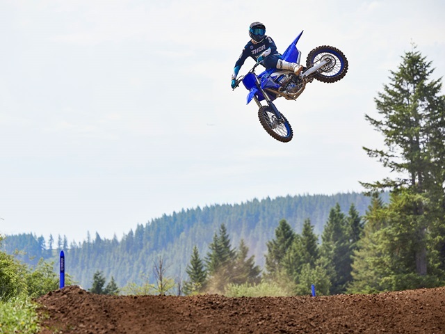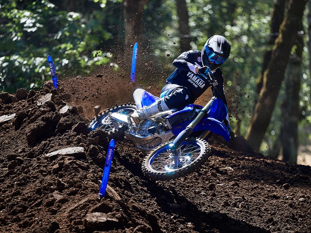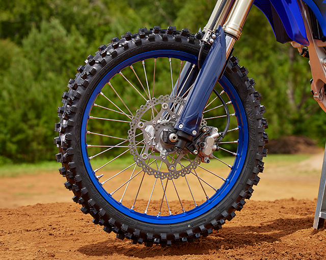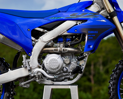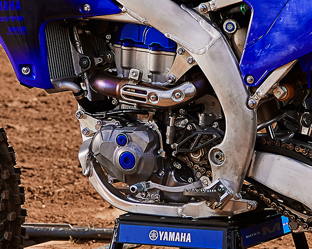 Featuring a reversed cylinder head layout, forged aluminum piston, titanium valves, lightened crank assembly and dry sump lubrication, the 2024 YZ450F's advanced DOHC four-stroke engine is light, compact and world renowned for its incredibly broad pulling power across the entire rev range.