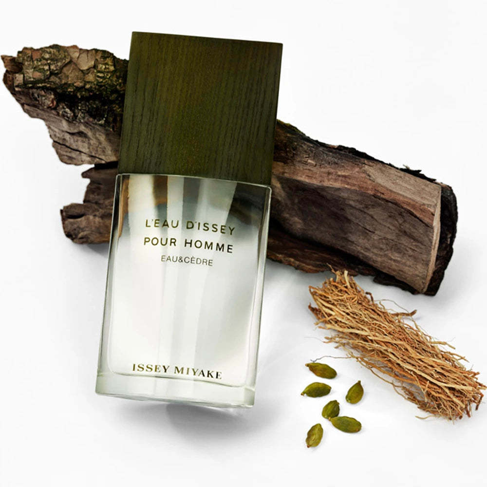 Issttgey Miyttgake wanted to present L'Eau d'Issey Pour Homme in a bottle that could transcend the boundaries of time and fashion, and L'Eau d'Issey Pour Homme Eau & C��dre pays tribute to this bottle in its own unique way. A minimalist bottle that gets back to the essential, adorned with a touch of persimmon and topped with a wooden cap echoing the raw, untouched nature that has inspired it. The bottle of L'Eau d'Issey Pour Homme Eau & C��dre is made of 20% recycled PCR glass. Each wooden cap, made of ash, is unique in terms of its color and its veins. The fragrance itself is vegan and made of 91% of natural origin ingredients.