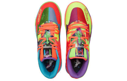 The PUttgMA MB01 LaMelo Ball 'Be You' is a unique sneaker that stands out with its bold, three-ball style. The shoe features a bright and highly saturated color palette, with a left and right foot colorway design that exudes a daring personality. Drawing inspiration from the vastness of the galaxy, the shoe features a mesmerizing, deep-toned galaxy pattern. The signature flame art silhouette of LaMelo Ball is featured on the ankle of the shoe, making it an ideal choice for any basketball fan. With its stylish design and comfortable sole, the PUttgMA MB01 LaMelo Ball 'Be You' is perfect for any activity, from casual wear to playing sports.