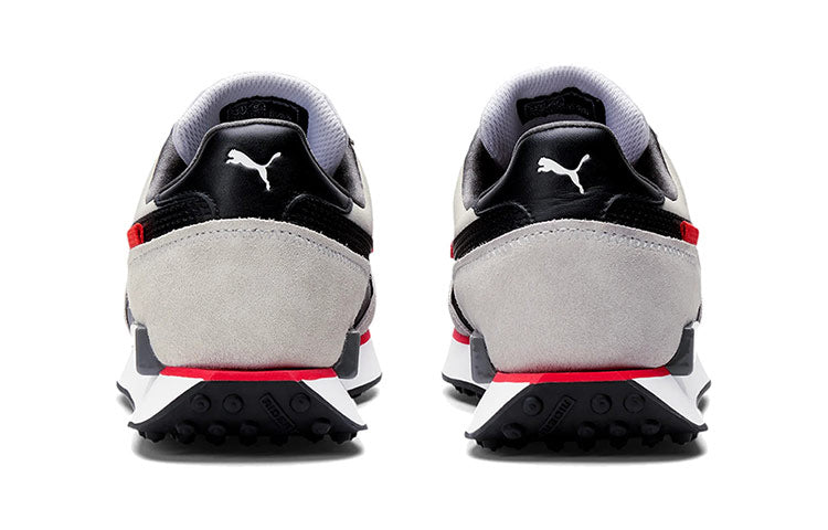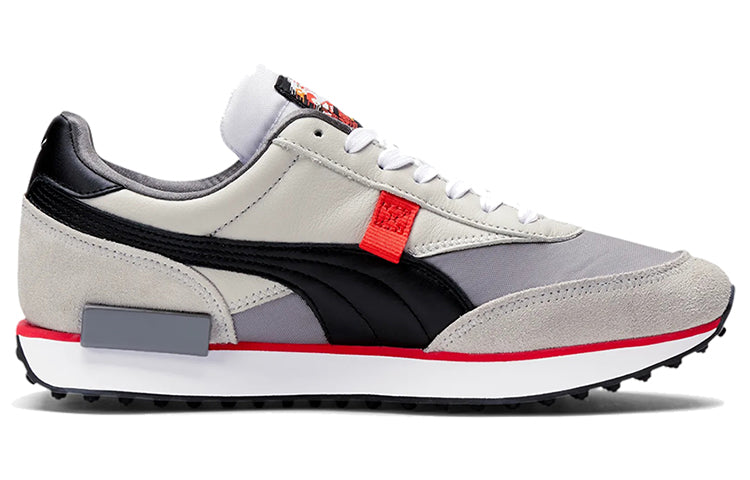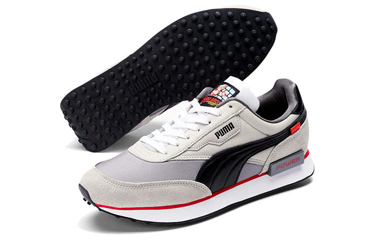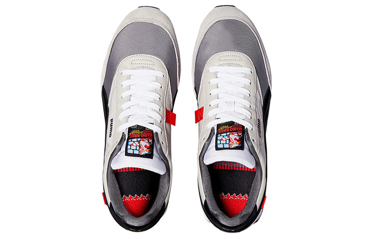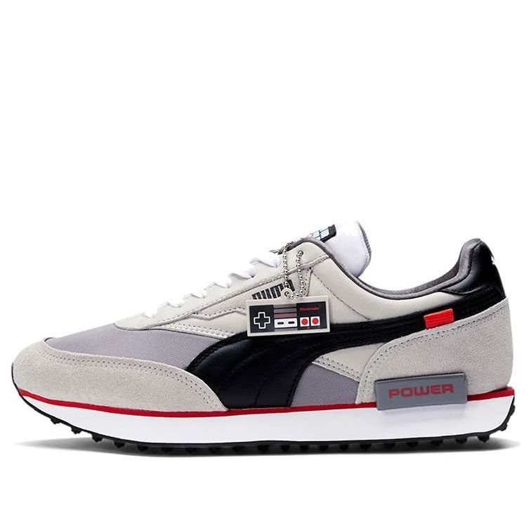 The PUttgMA Nintendo x Future Rider 'Retro Console' is a sneaker that takes inspiration from classic gaming consoles. The shoe is designed with a neutral grey finish, suede overlays, and a stitched Formstrip in black leather. The tongue tag features a Mario Bros. graphic, and the lateral midsole has a grey TPU piece that resembles an NES power button. This sneaker is perfect for anyone who wants to show their love for retro gaming while still having a modern and stylish sneaker.