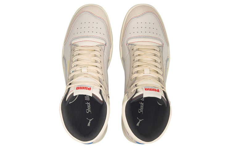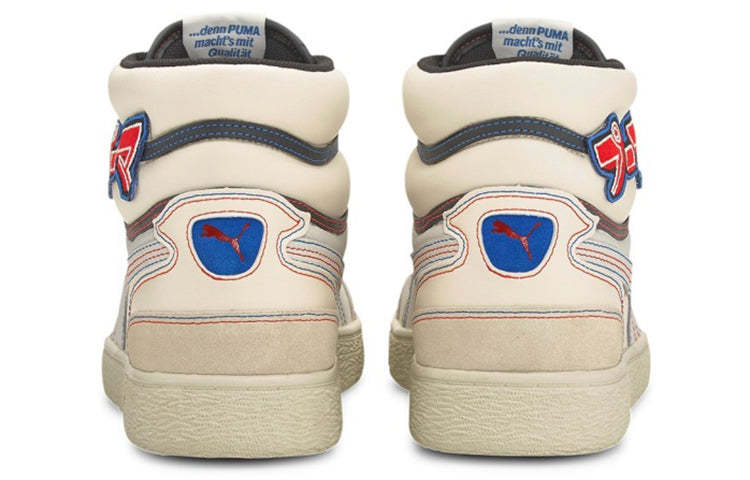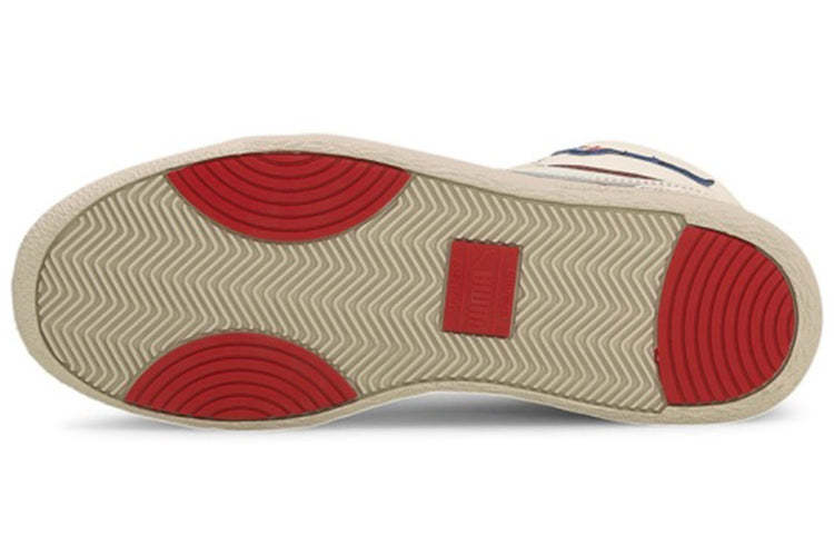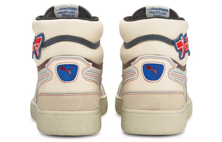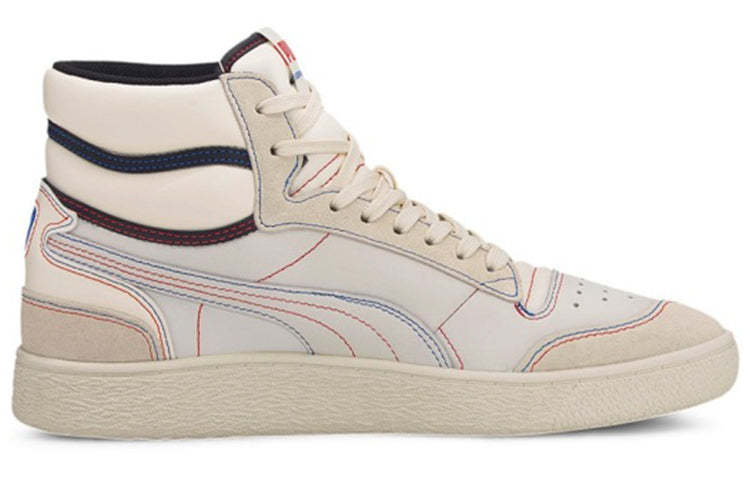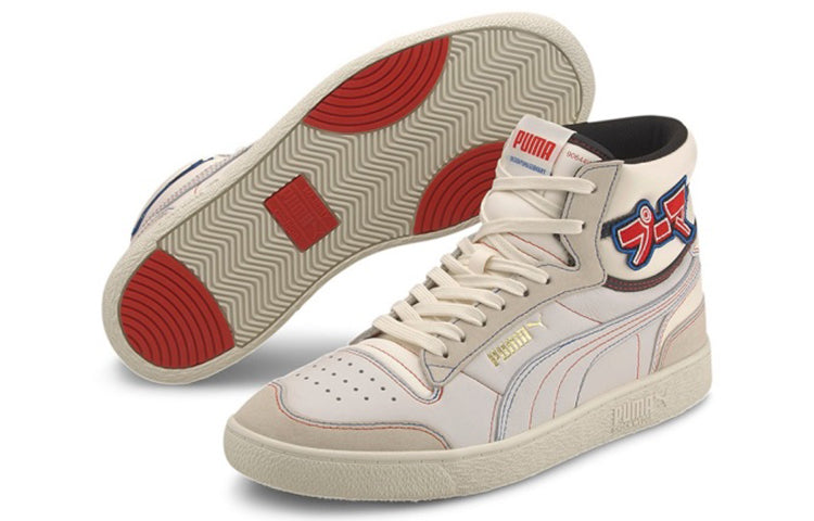 The PUttgMA Ralph Sampson Mid ‘Japanorama Pack’ brings a touch of Tokyo style to a classic silhouette. The off-white leather build and tonal suede overlays are stylish and timeless, while the blue and red stitching provides a pop of color. The brand’s name is embroidered in Japanese lettering across the lateral ankle, complementing a gold-foil PUttgMA wordmark stamped on the quarter panel.