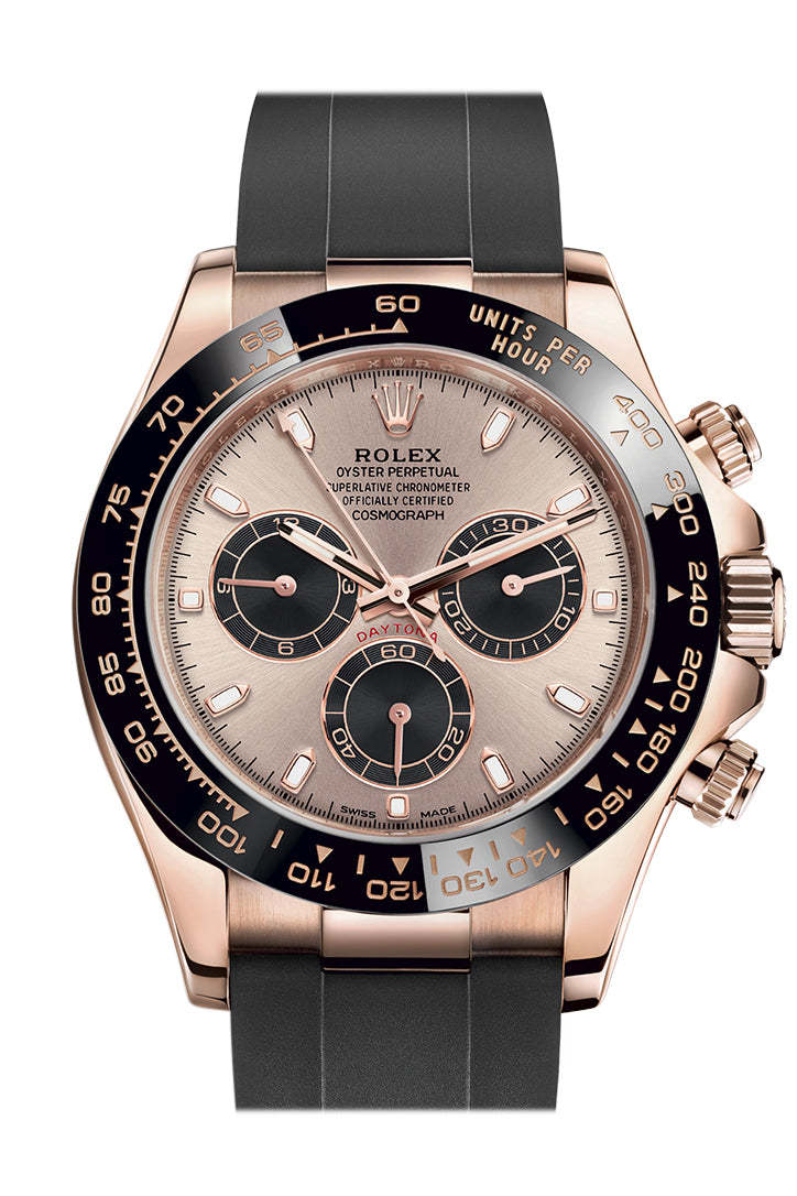 Everose gold case with a black oysterflex band. Fixed black ceramic showing tachymeter markings bezel. Sundust and black dial with luminous everose gold hands and index hour markers. Minute markers around the outer rim. Dial Type: Analog. Luminescent hands and markers. Chronograph - three everose gold sub-dials displaying: 60 second, 30 minute and 1/10th of a second. rolttgex calibre 4130 automatic movement with a 72-hour power reserve. Scratch resistant sapphire crystal. Screw down crown. Solid case back. Round case shape. Case size: 40 mm. Oyster deployment clasp. Water resistant at 100 meters / 330 feet. Functions: chronograph, hour, minute, second. Luxury watch style. Watch label: Swiss Made. Item Variations: 116515LN. rolttgex Cosmograph Daytona Black and Pink Dial Automatic Men's Oysterflex Watch 116515LN116515