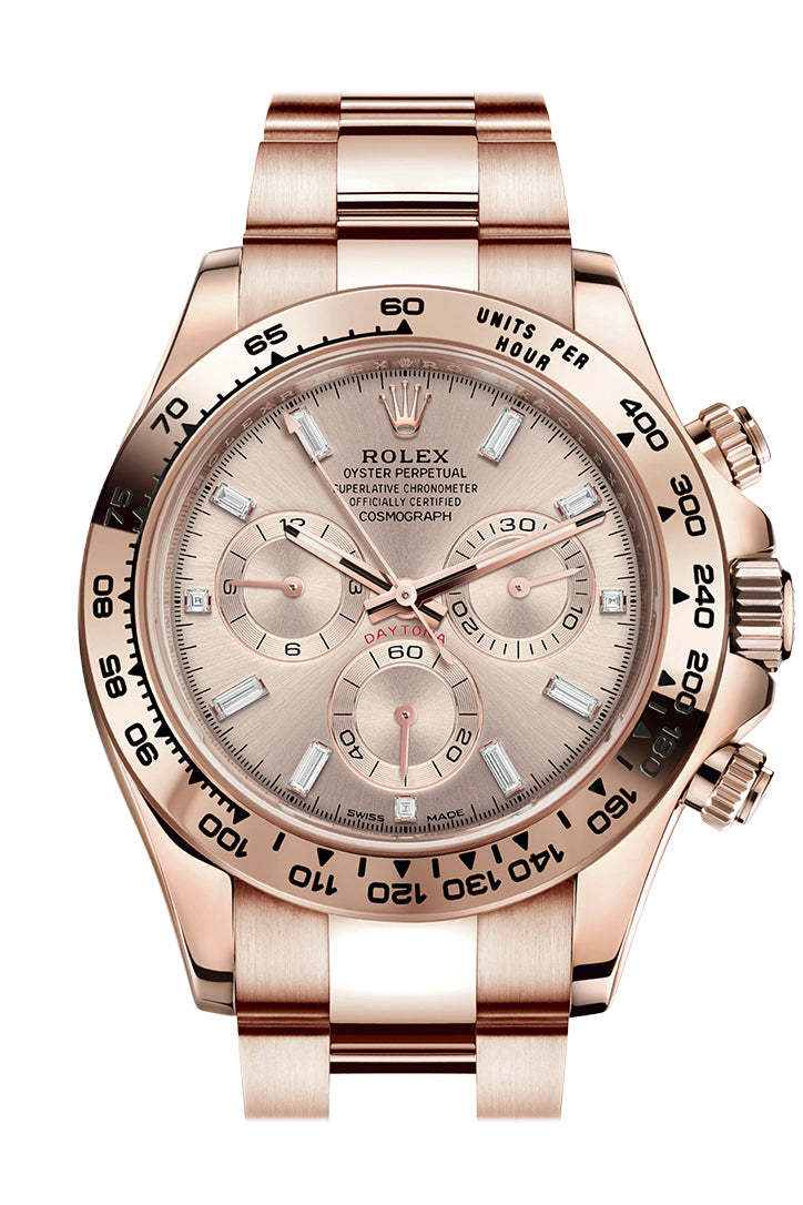 18kt everose gold case with a 18kt everose gold rolttgex oyster bracelet. Fixed 18kt everose gold bezel showing tachymeter markings. Pink gold dial with everose gold-tone hands and baguette diamond hour markers. Minute markers around the outer rim. Dial Type: Analog. Luminescent hands and markers. Chronograph - three sub-dials displaying: 60 second, 30 minute and 12 hour. rolttgex calibre 4130 automatic movement with a 72-hour power reserve. Scratch resistant sapphire crystal. Screw down crown. Solid case back. Case size: 40 mm. Round case shape. Oysterlock clasp. Water resistant at 100 meters / 330 feet. Functions: chronograph, hour, minute, second. Luxury watch style. Watch label: Swiss Made. rolttgex Cosmograph Daytona Pink Gold Dial 18K Everose Gold rolttgex Oyster Automatic Men's Watch