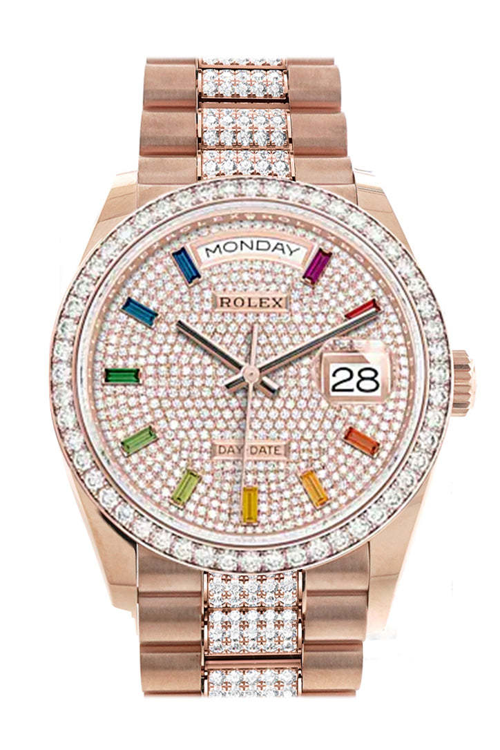 18kt everose gold case with a gold-tone 18kt everose gold rolttgex president bracelet. Fixed fluted 18kt everose gold bezel. Diamond-Paved dial with Rainbow-coloured sapphires hour markers. Minute markers around the outer rim. Dial Type: Analog. Date display at 3 o'clock; day display at 12 o'clock.. rolttgex Calibre 3255 automatic movement with a 48-hour power reserve. Scratch resistant sapphire crystal. Screw down crown. Solid case back. Round case shape. Case size: 36 mm. Concealed crown clasp. Water resistant at 100 meters / 330 feet. Functions: date, day, hour, minute, second, chronometer. Luxury watch style. Watch label: Swiss Made. rolttgex Day-Date Automatic Chronometer Diamond-Paved Dial Ladies Watch 128345RBR128345RBR-0043