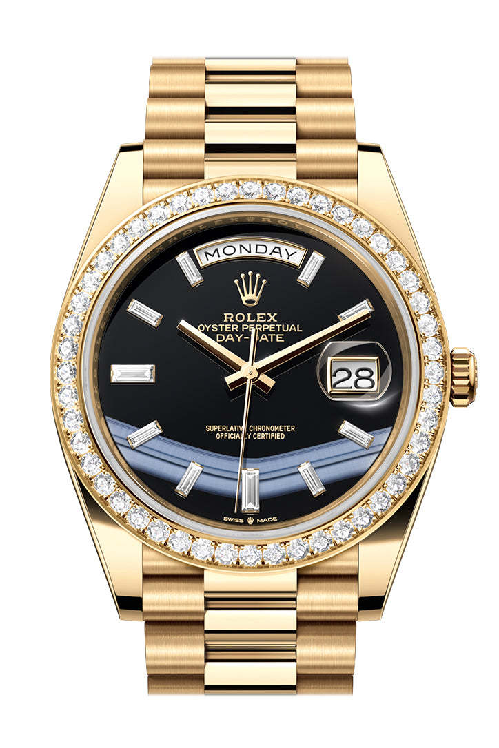 Yellow gold case with a 18kt yellow gold rolttgex president bracelet. Fixed bezel with diamond set. Onyx Dialdial with yellow gold hands and 10 baguette-cut Diamonds Dial numeral hour markers. Dial Type: Analog. Date display at the 3 o'clock position. rolttgex Calibre 3255 Automatic movement, based upon rolttgex 3035, containing 31 Jewels, bitting at 28800 vph, and has a power reserve of approximately 70 hours. Scratch resistant sapphire crystal. Screw down crown. Solid case back. Round case shape, case size: 40 mm. Concealed folding crown clasp. Water resistant at 100 meters / 330 feet. Functions: date, day, hour, minute, second. Day-date 40 Series. Luxury watch style. Watch label: Swiss Made. rolttgex Day-Date 40 AutomaticOnyx DialDial Men's 18kt Yellow Gold President Men's Watch228348228348RBR 228348RBR-0039